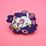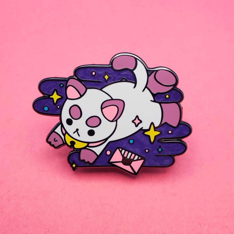 "Space Outlaw" is a 2" pin made with high quality hard enamel and a black nickel plating. It features Puppycat from the YouTube and Netflix series Bee and Puppycat. The space substance in the background is filled with shiny pearlescent enamel!
